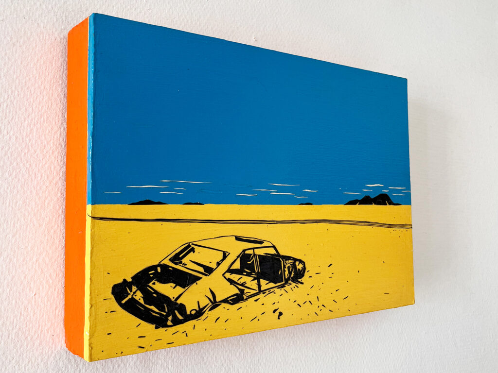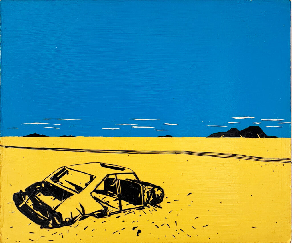 Car in the Sahara (2008) a fait le voyage transatlantique avec moi, soigneusement rangée dans ma valise lors de mon déménagement des États-Unis vers la France en 2015. Née de ma fascination durable pour les lieux reculés et isolés, cette œuvre appartient à une série explorant la solitude et la distance. Des années plus tard, alors que ma pratique continue d’évoluer, je me retrouve à revenir vers cette pièce avec une tendresse particulière.
